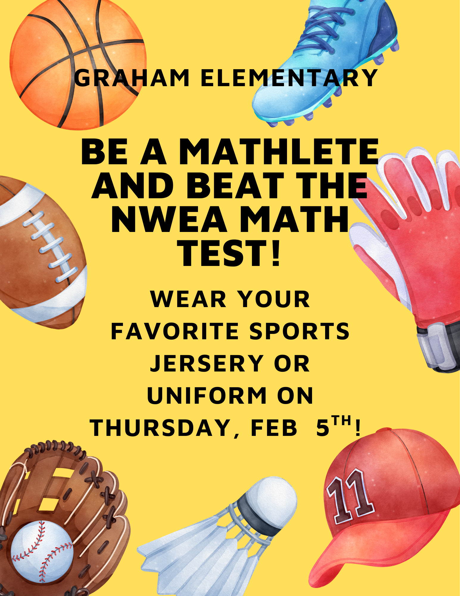 Spirit Day - Be a Mathlete & Beat NWEA Math Test - Wear favorite Sports Jersey or UniformDate: Feb 5Calendar: Graham Elementary